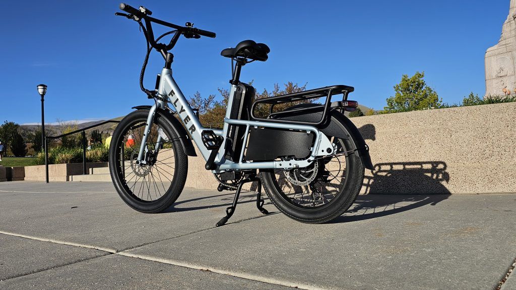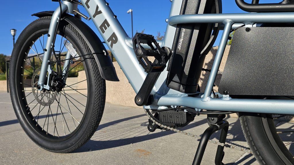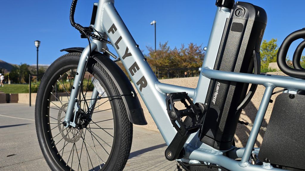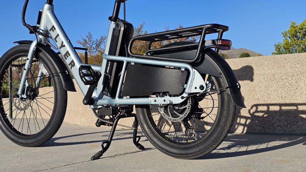 The Flyer Flex comes equipped with a 500W brushless rear hub motor, enabling it to reach speeds of up to 20 mph, adhering to Class 2 e-bike regulations. It offers both pedal assist, with a torque sensor for a more natural riding feel, and a thumb throttle for on-demand power. I found the torque sensor particularly impressive; it makes the pedal assist feel very intuitive and smooth. The battery options include a standard 48V 9.8Ah (458Wh) battery, providing a decent range of 20-40+ miles, and an extended-range 48V 15Ah (687Wh) battery, increasing the range to 30-50+ miles. The bike also features hydraulic disc brakes for reliable stopping power, a 7-speed Shimano drivetrain, and puncture-resistant tires (24″ front, 20″ rear) for enhanced durability. I’ve always appreciated hydraulic brakes on bikes, and they perform exceptionally well here.