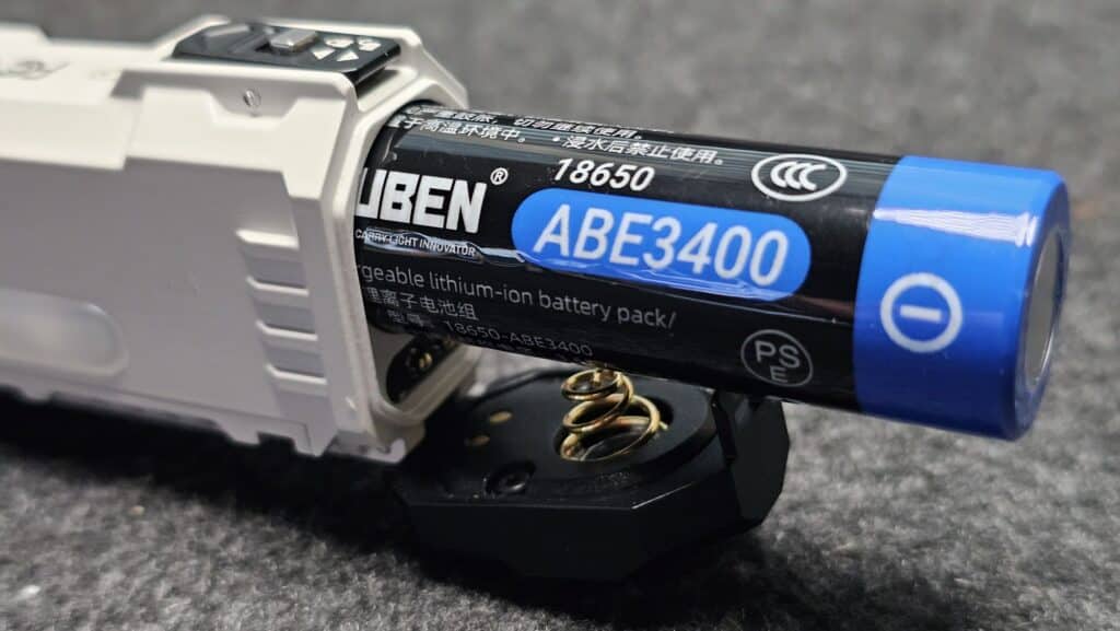 The flashlight comes with 5-year warranty 15-day replacement. I really love the physical buttons on it as opposed to the single buttons that require multiple click combinations that are confusing and hard to remember. There’s a single button on top to turn the lights on and off, there’s a wheel on the side that adjust the brightness. There’s a single button on the back when held down will turn on the light that simple.